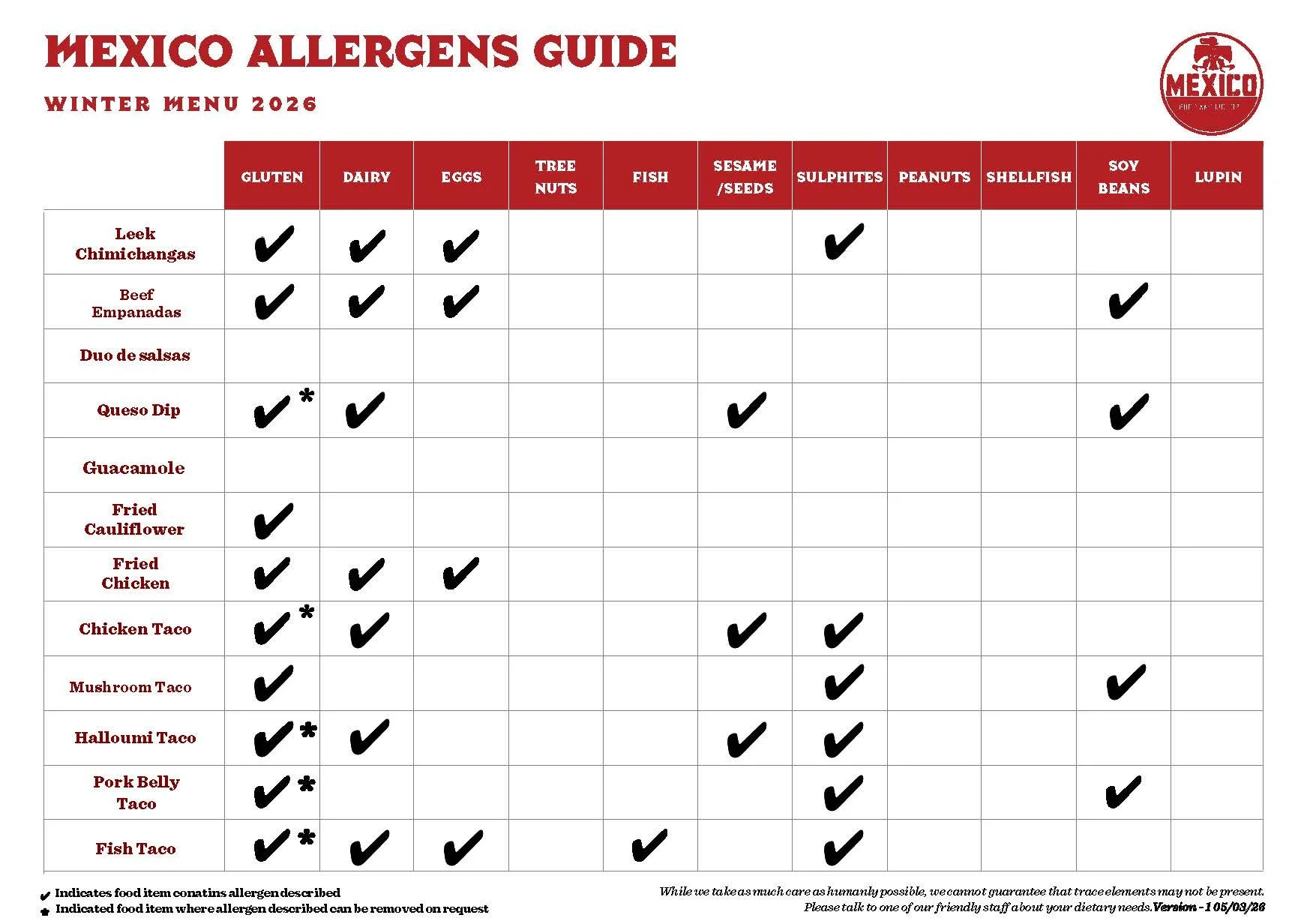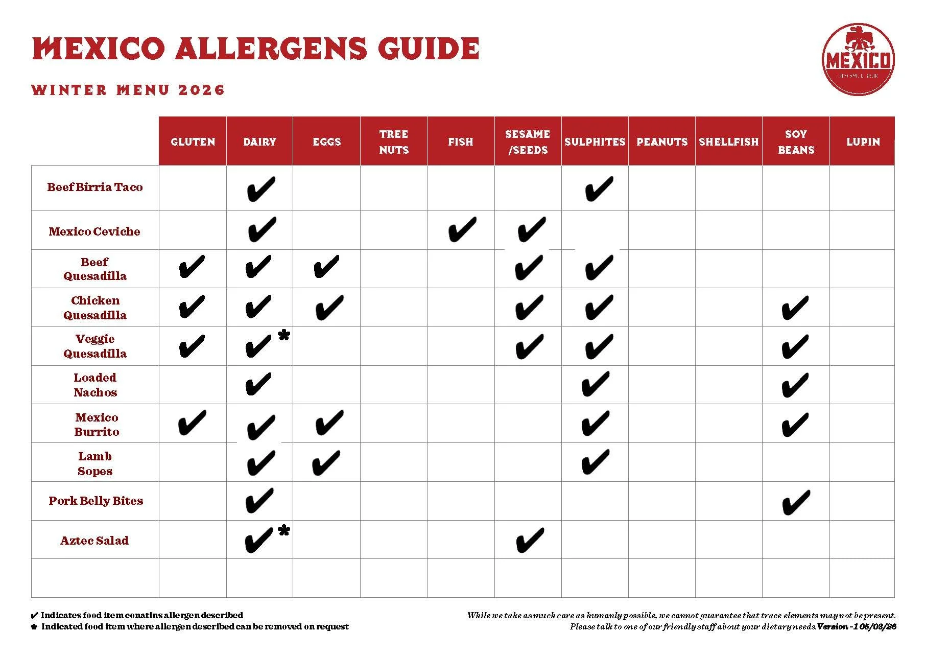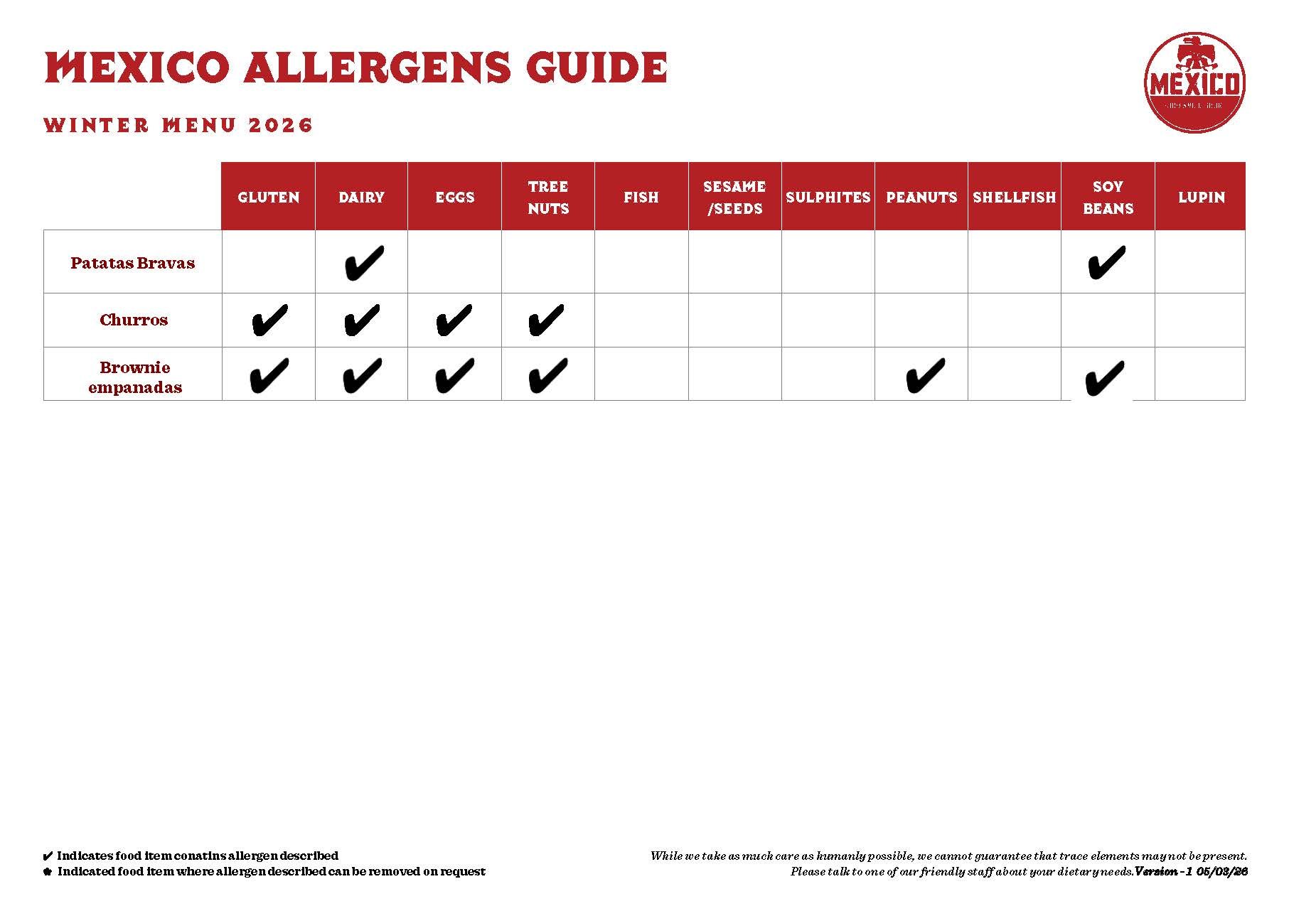 This guide indicates allergens present in our 2026 Autumn Winter Menu